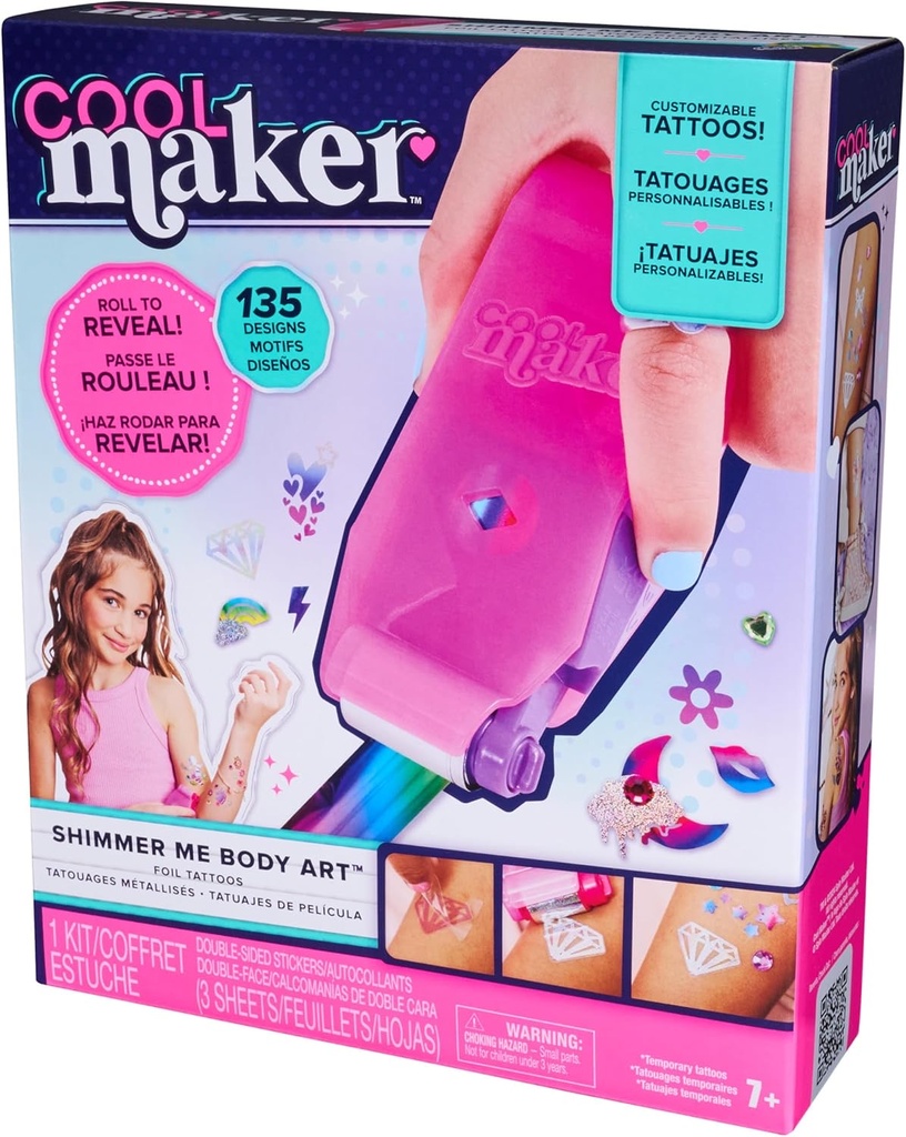 The Cool Maker Shimmer Me Body Art kit lets kids create temporary tattoos using 135 double-sided stickers, 3 metallic foils (silver, purple/pink, rainbow), and an easy-to-use roller.Apply the sticker