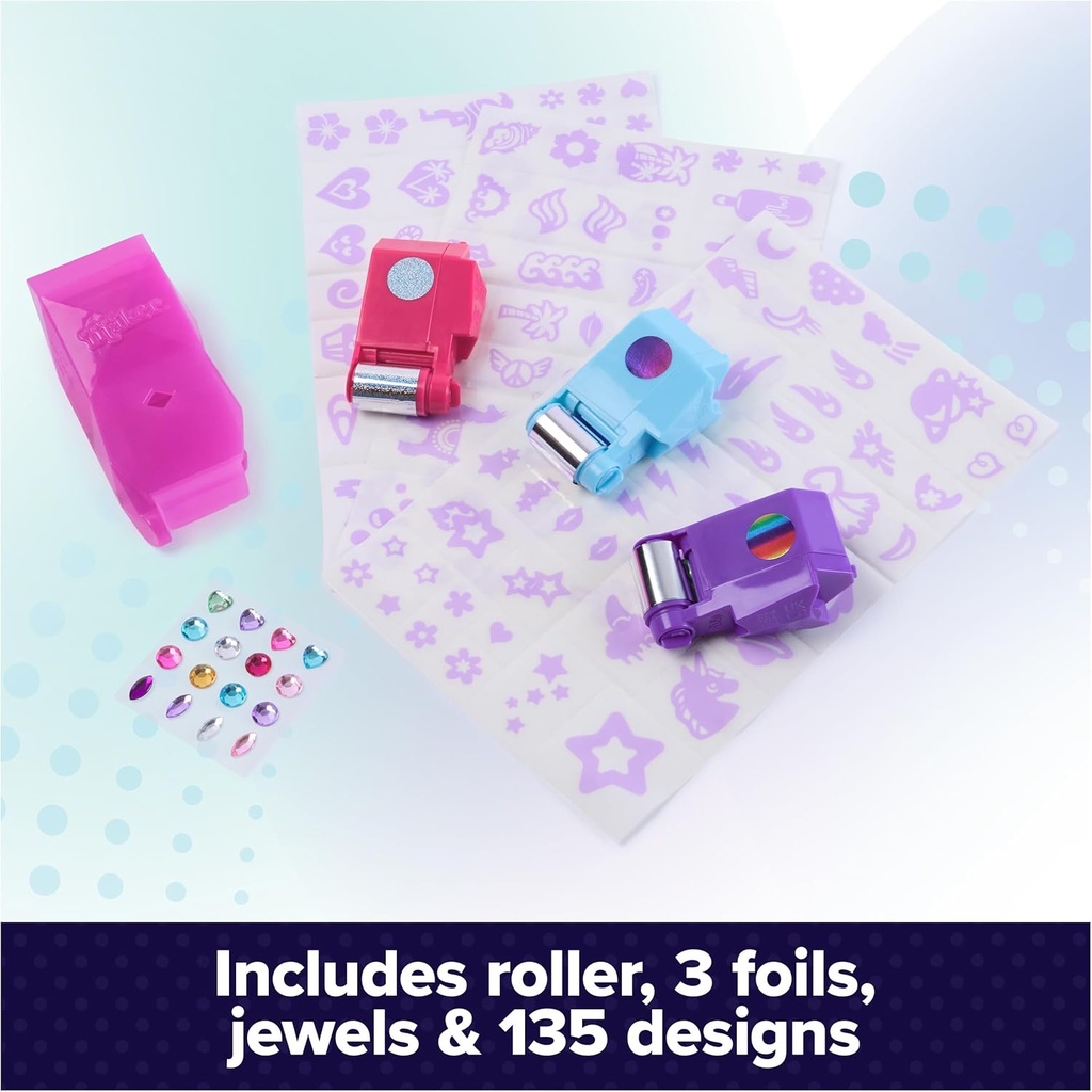 The Cool Maker Shimmer Me Body Art kit lets kids create temporary tattoos using 135 double-sided stickers, 3 metallic foils (silver, purple/pink, rainbow), and an easy-to-use roller.Apply the sticker, glide the roller to transfer the foil, and customize with included jewels.Includes roller, 3 foils, 3 sticker sheets, and 1 gem sheet.