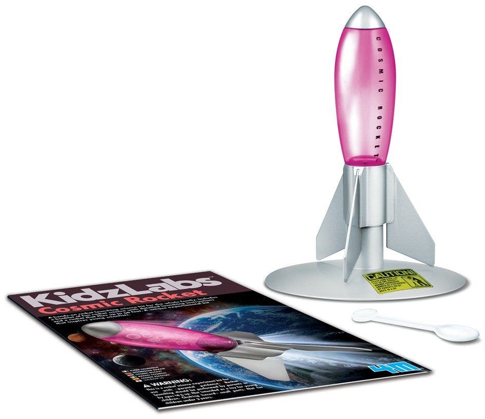Make up your rocket and decorate it with the included stickers.Simply add baking powder and vinegar, then watch it shoot up in the sky about 10 metres high.This kit is recommended for children over