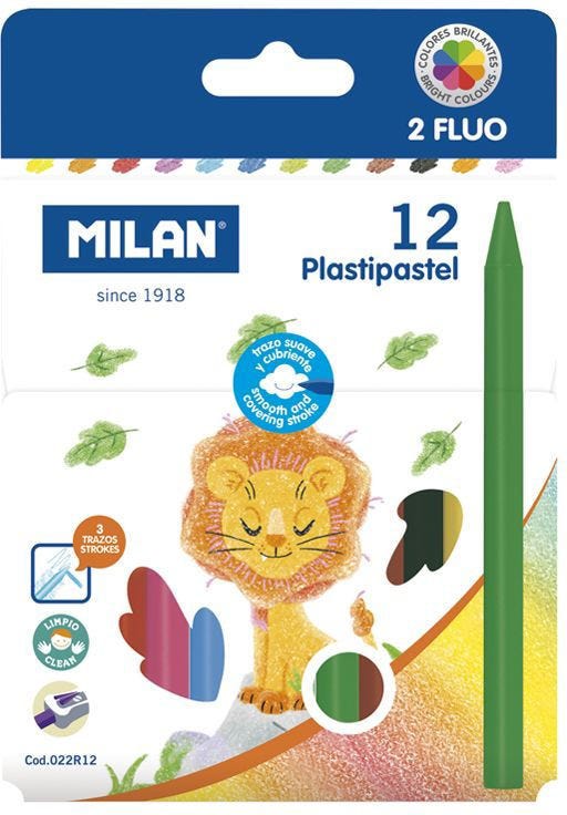 10 Plastipastel in basic colors and 2 in Fluo colours.Circle shape.New formula: softer and more covering line.The Plastipastel are clean and resistant colored pencils, ideal for the little ones.3 different strokes: allows you to draw thin strokes with the tip, thick strokes with the back and wide areas with its entire length.
