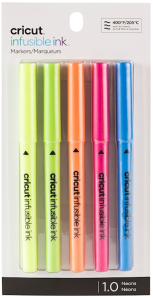 Watch your designs bloom into vibrant, permanent, pro-quality transfers on any compatible Infusible Ink blank when you create with these five neon heat press transfer markers.Draw your designs freehand or use your Cricut smart cutting machine to draw or write your custom design on plain laser copy paper.Available in variety of colors and two different line weights, Infusible Ink Pens & Markers bloom into rich, vibrant hues once transferred using high temperatures.The results are bright, beautiful, seamlessly smooth transfers that never flake, peel, wrinkle, or crack!