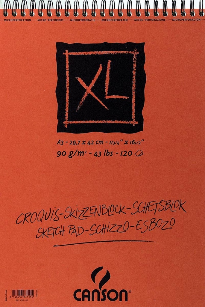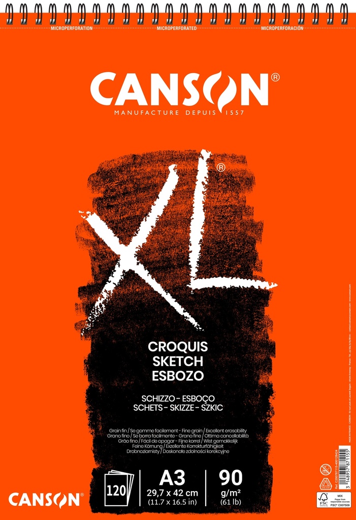 Papier van 90 g/m².Papier met een weinig uitgesproken korrel, zeer opdikkend.Geschikt voor snelle schetsen: potlood, pastel, houtskool en sanguine.Met spiraalbinding op de korte zijde.Met microperforatie.