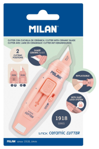 Cutter with replaceable ceramic blade.STICK design, 1918 series in pink.Blade with protector and safe lock system.Slider button with two positions.Small pocket size.With its ergonomic design, it