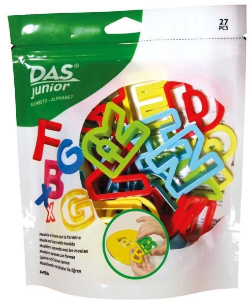 The ideas of the little ones take shape with DAS Junior.DAS Junior is here, the DAS for little creatives! Modeling paste, ideal for school and for children aged 3 and up, soft and ready to use.The package contains 26 letter molds and 1 rolling pin.All accessories are made of colored and resistant plastic.The pouch has a resealable minigrip.