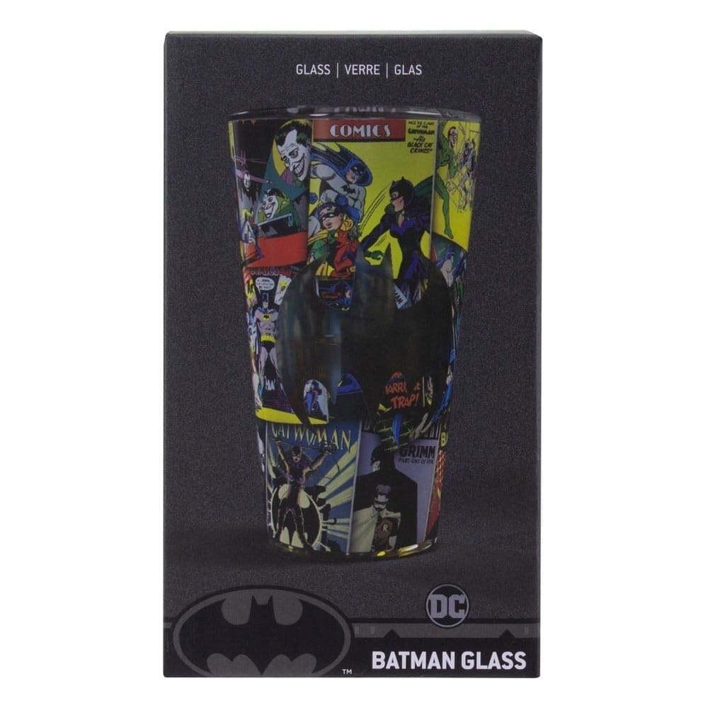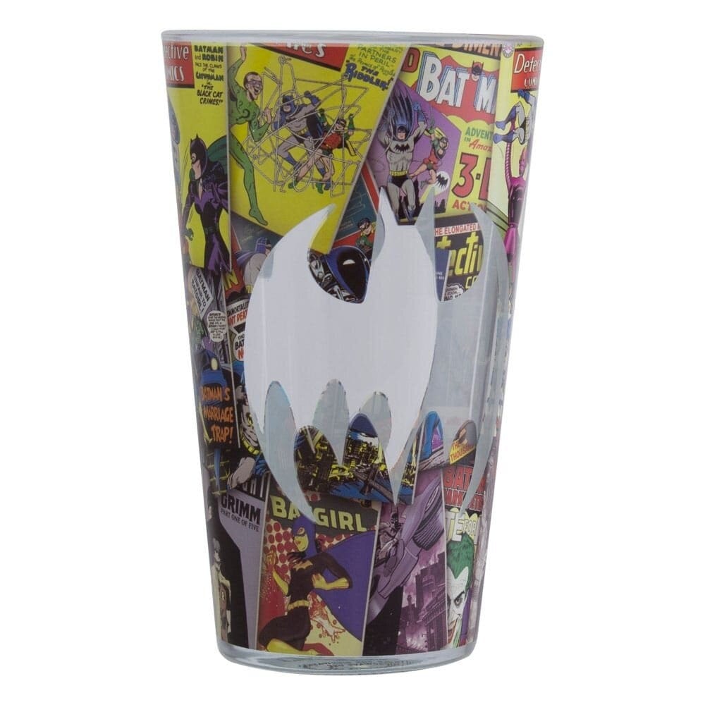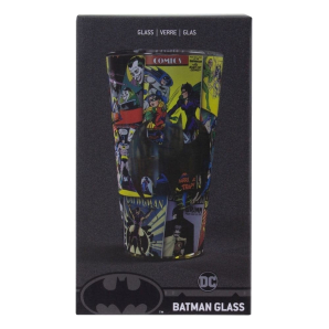 An amazing glass decorated with various frames from classic Batman comics.In the center is a transparent bat logo that automatically takes on the color of any drink you fill the glass with.Packaged