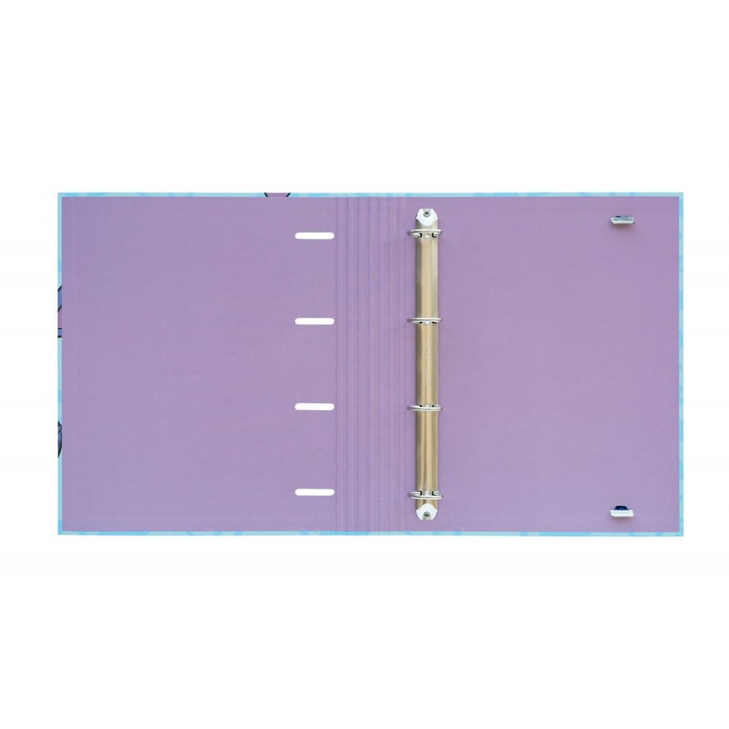 This Stitch school folder is made of 2 mm thick cardboard hardcover lined with 150 gram matte laminated paper.It measures 32 centimeters high by 27.5 centimeters wide.It features a four-ring, 35-mil
