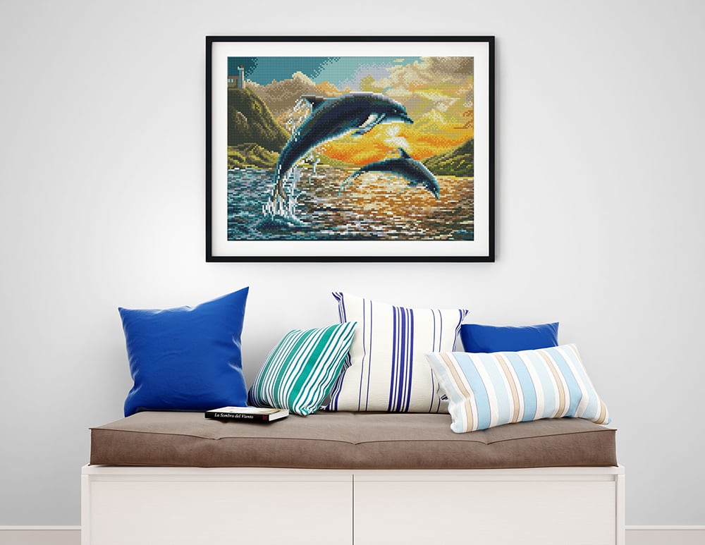 Dolphin Sunset - Pre-Framed Square Diamond Painting Artwork Kit - 16.54 x 12.4 inThe Diamond Dotz Squares Kit comes with everything you need to complete this beautiful artwork.Features full diamond coverage with the spectacular sparkling results of our new square shaped diamonds.Enjoy the extra dimension of working with Diamond Dotz Squares.Shop Dolphin Sunset - Pre-Framed Square Diamond Painting Artwork Kit today.