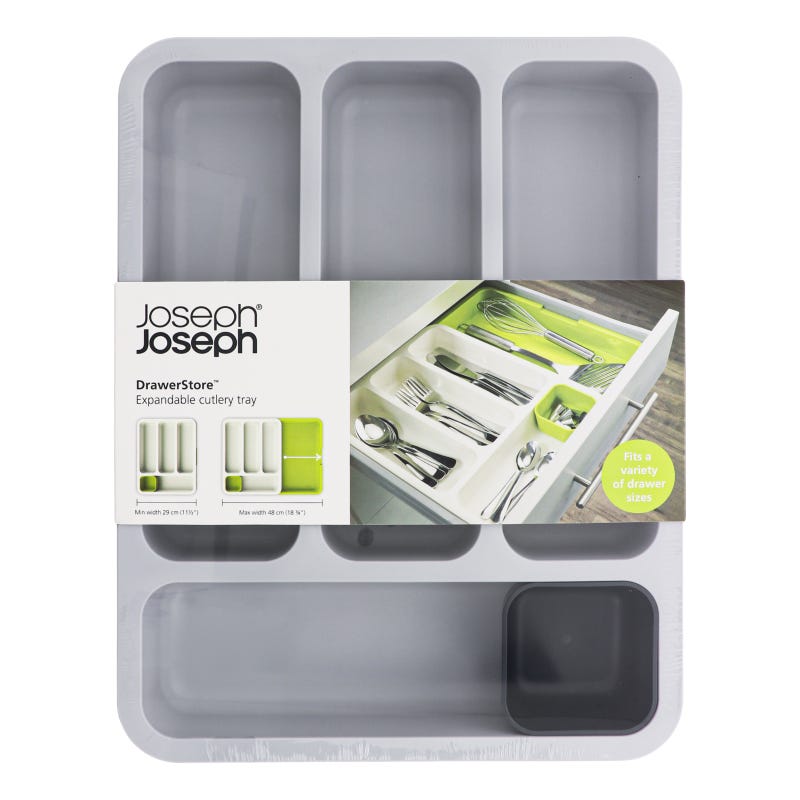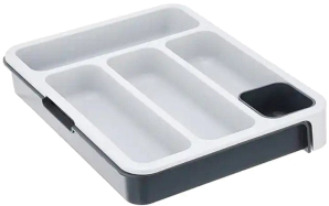 Organize messy cutlery drawers with this practical and smart storage solution.The two halves of the tray can be finely adjusted to fit a variety of drawer sizes and lock securely together once in place.The design provides four deep-sided compartments for holding cutlery, a utensil area for knives or larger kitchen tools and a handy, moveable storage dish for small, loose items.Fits a wide range of drawer sizes from 11.4 inches up to 18.9 inches.Wash and dry by hand.