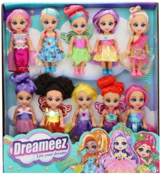Get ready for an unforgettable magical journey with this extraordinary set containing 10 charming miniature dolls.Each of them represents a unique character that will take you to the magical world of fairy tales.Discover the magic of tiny fairies, a beautiful princess and a glittering mermaid in this beautiful Dreameez mini doll set.
