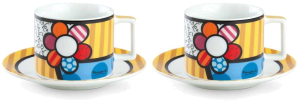 Very nice collection of cappucino coffee cups signed by romero britto.romero britto is a brazilian artist, painter and sculptor born in 1963.his works feature elements of pop art, cubism and graffiti.