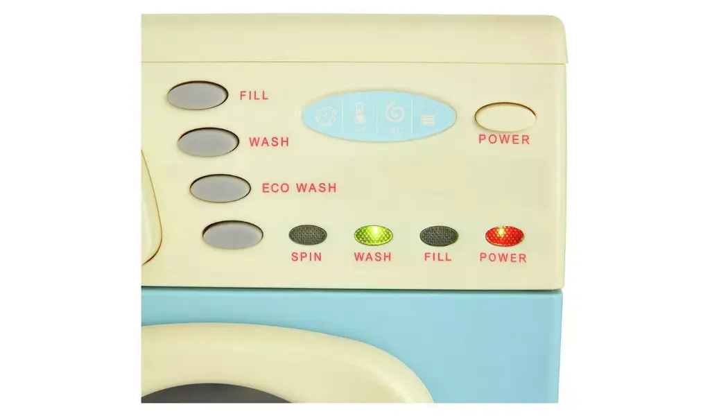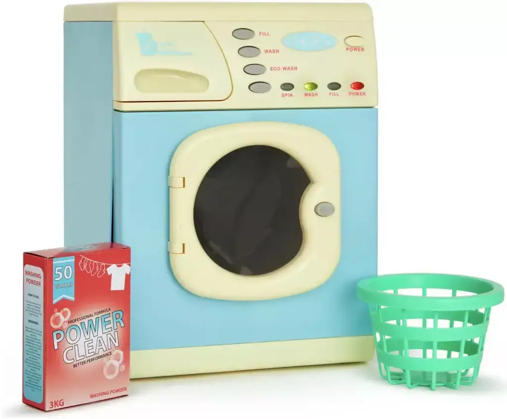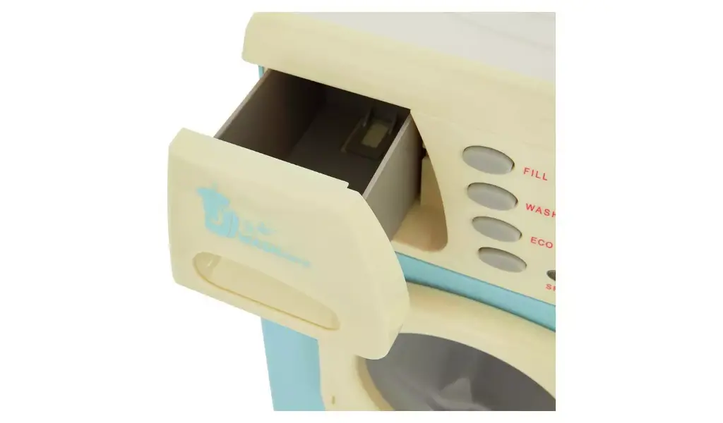 A realistic toy washing machine with opening powder drawer, lights and sound effects.Pretend washing powder box included.Height: 30cm.Requires 3 x C batteries (not included).Suitable for ages 3+.