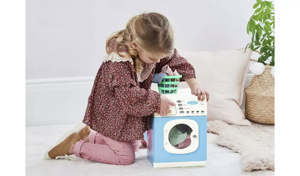 A realistic toy washing machine with opening powder drawer, lights and sound effects.Pretend washing powder box included.Height: 30cm.Requires 3 x C batteries (not included).Suitable for ages 3+.Also available in pink.REALISTIC ROLE PLAY: Little Helpers can explore their imagination and develop social skills through assisting with jobs around the home.INSPIRED BY REAL WASHERS: Empty the washing basket, load up the washer, put in the powder and choose a wash speed.Accompanied by lights and realistic sounds.DEVELOP MOTOR SKILLS: Playing with the Electronic Washer encourages the development of hand-to-eye coordination, problem solving, motor skills and visual stimulation.INCLUDES: Spinning drum with two speeds, buttons, lights, sounds, opening powder drawer, pretend washing powder, and laundry basket.SUITABLE FOR AGES 3+: Three C batteries required.