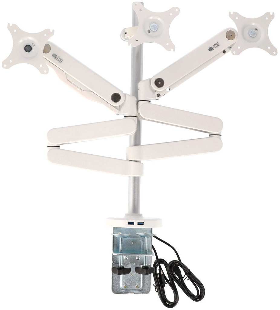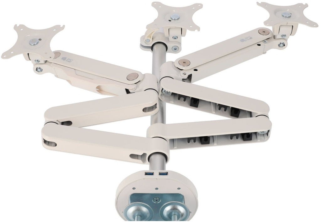 Gas spring inside for free adjustment.Full rotation, 360 degree at any position.Made of aircraft aluminum.Simple and stylish modeling, compact and rugged.With dual USB ports.Support monitor up to 30''.
