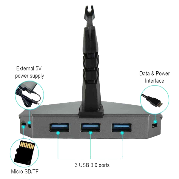 Vem com 3 portas USB 3.0 (compatível com dispositivo USB 2.0), leitor de cartão micro SD/TFPode suportar até 2 TB de unidade externa portátil; 5 Gbps