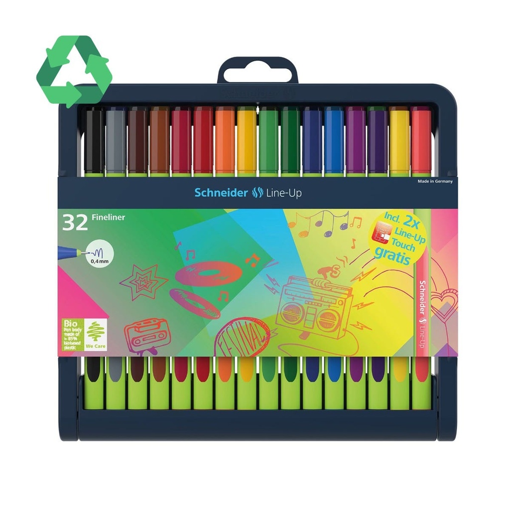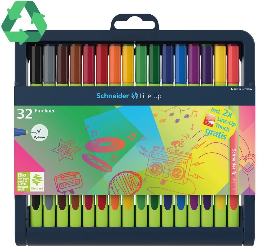 The first fineliner with a barrel of 88% bio-based plastic.Awarded with the world's best-known eco-label "Blue Angel" for particularly resource-saving and environmentally friendly production.With its wide range of colours and its slim design it is a perfect companion for putting drawing and writing in the spotlight.The cap-off ink does not run dry even if the cap is removed for 2-3 days (except neon colours).Relaxed writing is ensured with the rubberised, ergonomic triangular barrel.The Line-Up is produced CO2 neutral.The convenient adjustable pencil case is durable, can be used as case penholder and is also made of waste from internal plastics processing.Content: Sapphire-Black, Space-Grey, Mahogany-Brown, Topaz-Brown, Royal-Red, Romantic-Red, Tango-Orange, Golden-Yellow, Highland-Green, Blackforest-Green, Lapis-Blue, Alaska-Blue, Electric-Purple, Daytona-Violet, Neon-Yellow, Neon-Red, Touch Sapphire-Black, Touch Lapis-Blue, Silver-Grey, Vulcan-Yellow, Carmine-Red, Coral, Apricot, Apple-Green, Olive-Green, Nautic-Green, Mystic-Blue, Mineral-Blue, Fashion-Pink, Neon-Green, Neon-Orange, Neon-Pink.Line width 0,4 mm.