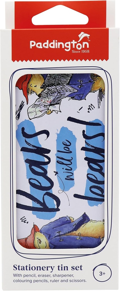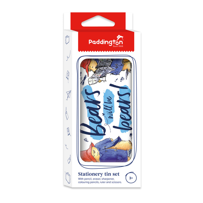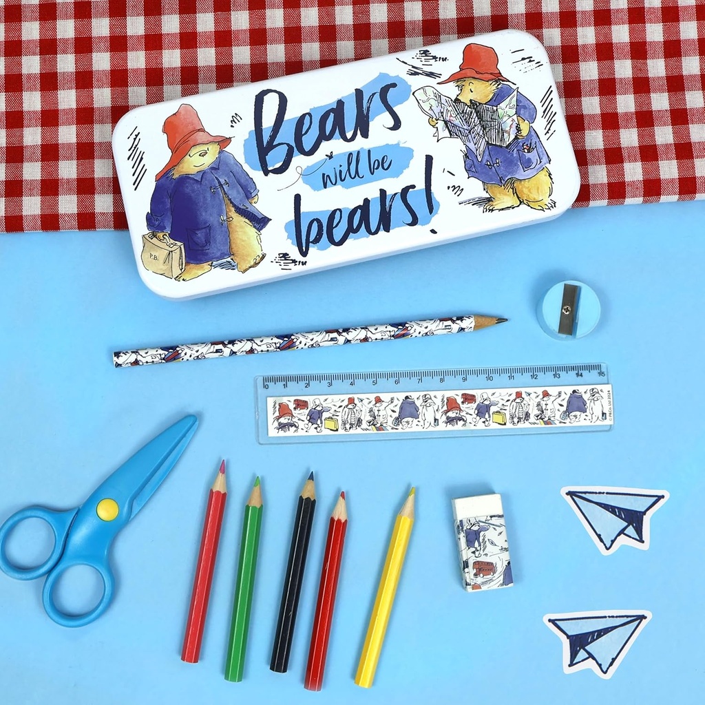 This delightful and practical Paddington stationery tin set features eye-catching illustrations of the beloved and colourful bear from Peru! This set comes with a Pencil, Eraser, Sharpener, Colouring
