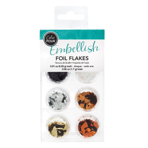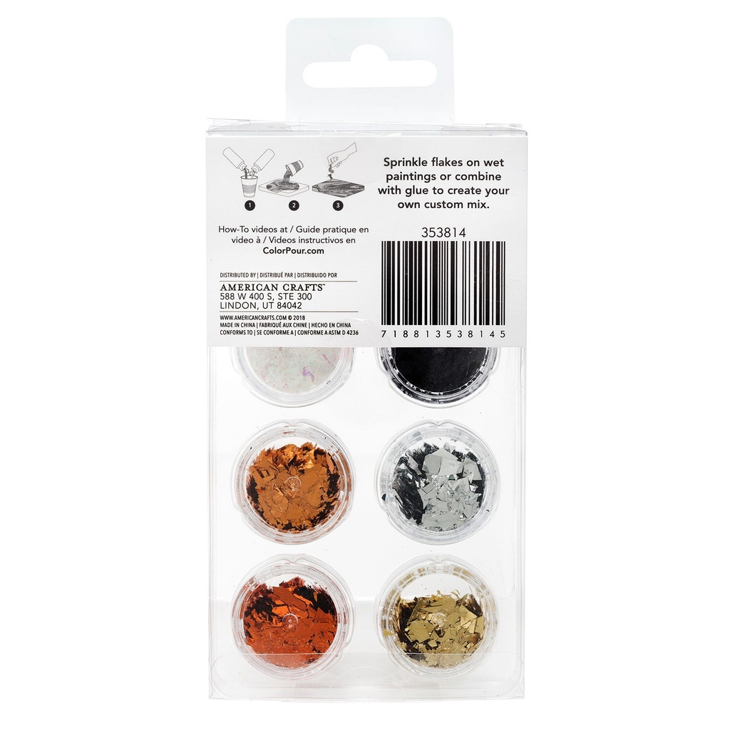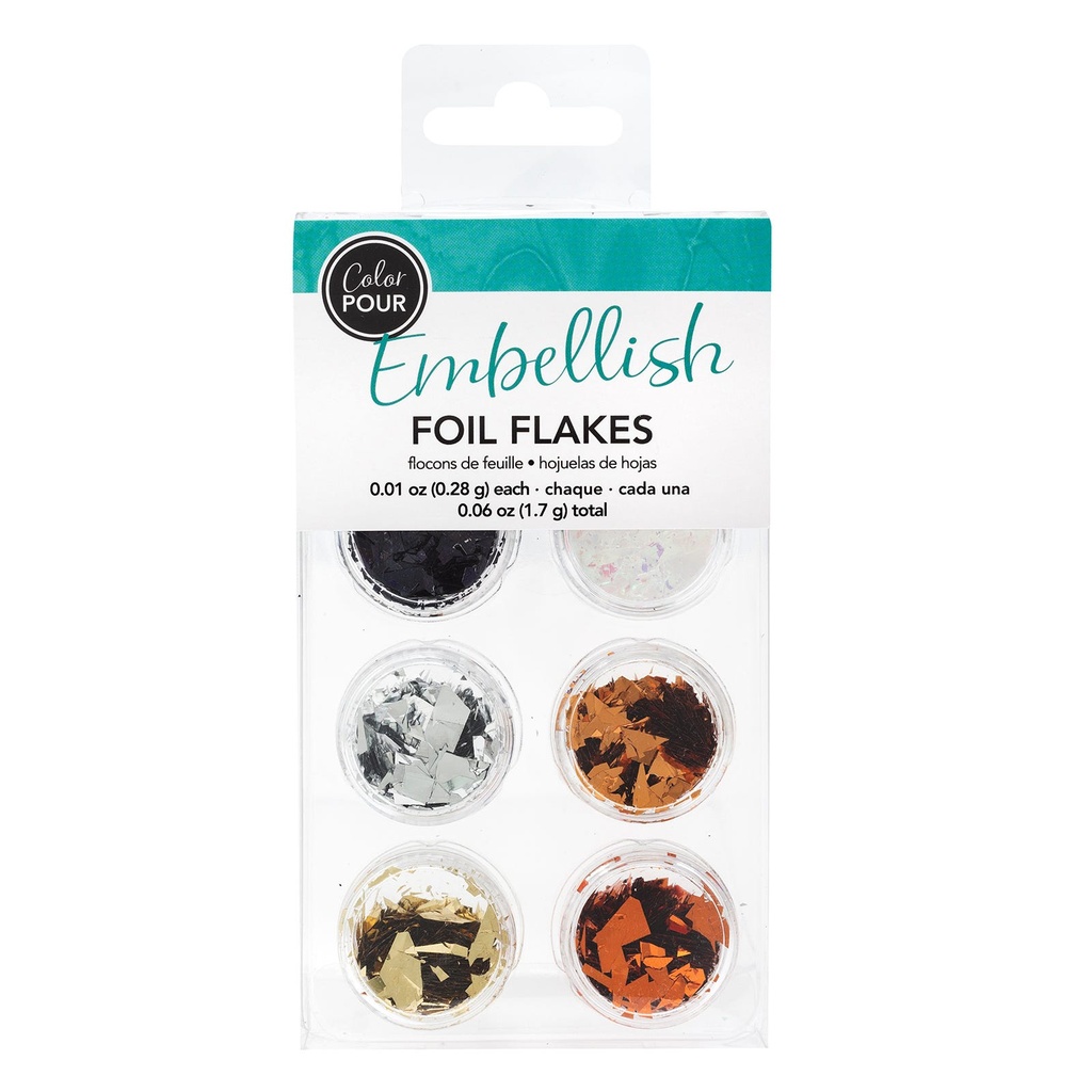 Add a little shine and texture to your Color Pour projects with foil flakes! These metallic flakes can be applied to wet artwork, or can be combined with glue and added later.This package includes six bottles of flakes in a neutral metallic color palette.