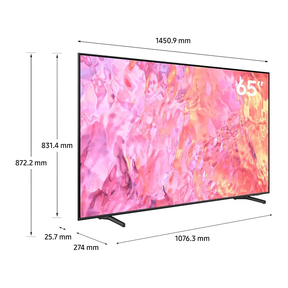 Samsung's 65-inch OLED 4K Smart TV, with its OLED screen, delivers vibrant colors and deep blacks in breathtaking 4K resolution.HDR 10+ technology ensures lifelike detail and contrast, enhancing every viewing experience.Dive into a world of endless entertainment with built-in smart features, offering a variety of streaming apps, web browsing, and convenient voice control.Seamlessly blend your TV into your living space with Ambient Mode+, transforming it into a piece of art or displaying useful information when not in use.With its sleek and slim design, nearly bezel-less screen, and cutting-edge technology, this TV adds elegance and sophistication to any living space, making it the ultimate choice for discerning viewers.Utilizes quantum dots to enhance color accuracy and provide a wider range of colors for a more lifelike viewing experienceSupports Quantum HDR0 for brighter highlights and darker shadows, resulting in enhanced picture quality