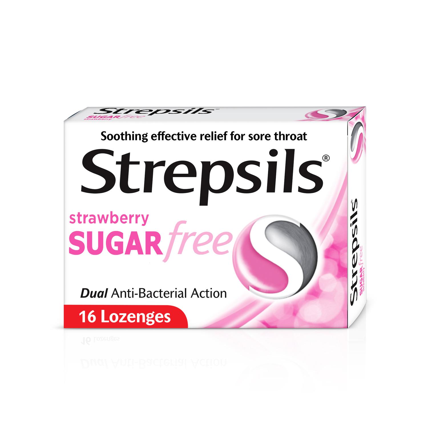 Strepsils Strawberry Sugar Free, Soothing Effective Relief for Sore Throats, 16 Lozenges