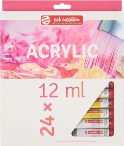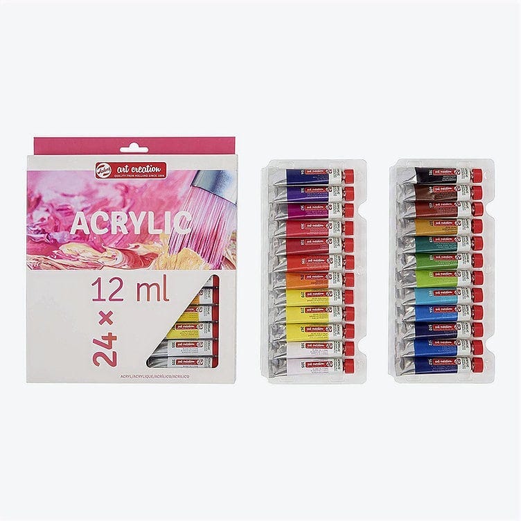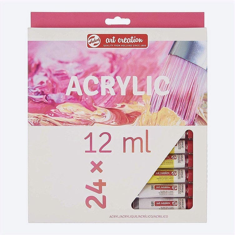This acrylic colour set of 24 x 12 ml tubes offers a great variety of colours to create various paintings with.Save time on mixing custom colours with the extensive colour selection of this set! Because of their convenient size, these tubes are ideal to have in your studio or to take with you while you travel.Talens Art Creation also offers sets of 6, 8 and 12 tubes, and a starter set with everything you need to begin your acrylic painting journey.Contents: 24 x 12 ml tubes (2 x 105 Titanium White – 267 Azo Yellow Lemon – 275 Primary Yellow – 270 Azo Yellow Deep – 276 Azo Orange – 396 Naphthol Red Medium – 318 Carmine – 369 Primary Magenta – 567 Permanent Red Violet – 568 Permanent Blue Violet – 504 Ultramarine – 512 Cobalt Blue (Ultramarine) – 572 Primary Cyan – 570 Phthalo Blue – 564 Brilliant Blue – 661 Turquoise Green – 617 Yellowish Green – 618 Permanent Green Light – 619 Permanent Green Deep – 227 Yellow Ochre – 411 Burnt Sienna – 409 Burnt Umber – 701 Ivory Black). About Talens Art Creation acrylic coloursTalens Art Creation acrylic colour is a reliable quality acrylic paint based on acrylic resin.The paint has a pasty consistency, dries quickly and has a silky gloss when dry.These acrylic colours can be used both straight from the tube and thinned with water and are waterproof when dry.The colours are easy to mix with one another and easy to use due to their dosing cap.This versatile paint can be used on almost any surface, as long as it is somewhat absorbent and free of grease and dust.From canvas and paper to plaster, board, wood, stone and cement.Since the tubes are transparent, you can easily pick the colour you want to use while painting.