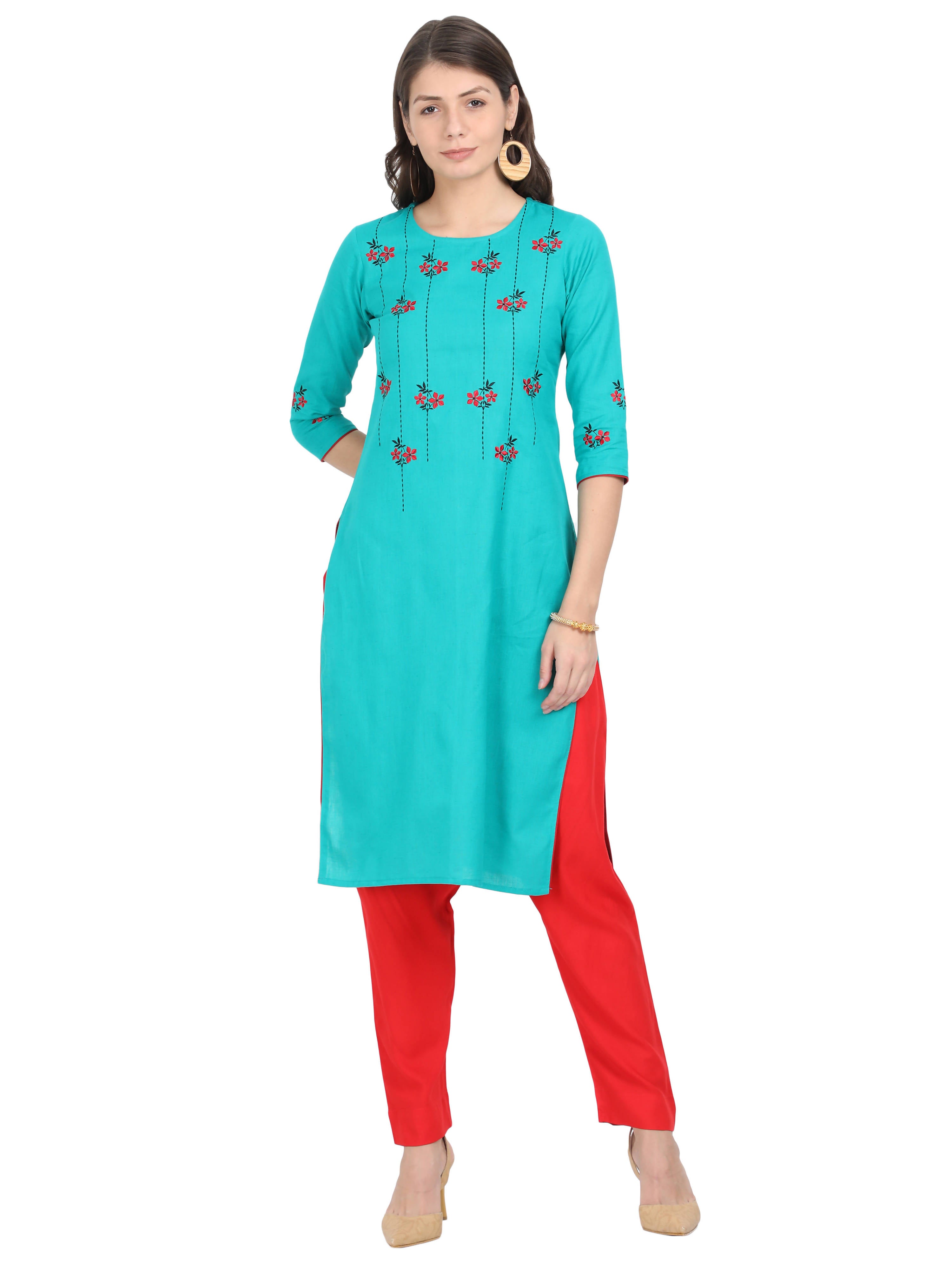 Women Blue cotton embroidered top and Red rayon pant