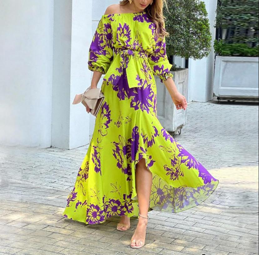 Women Off Shoulder Floral Print Ankle Length Slash Neck Maxi Dress B-5876049.00NovoProduto Limitado