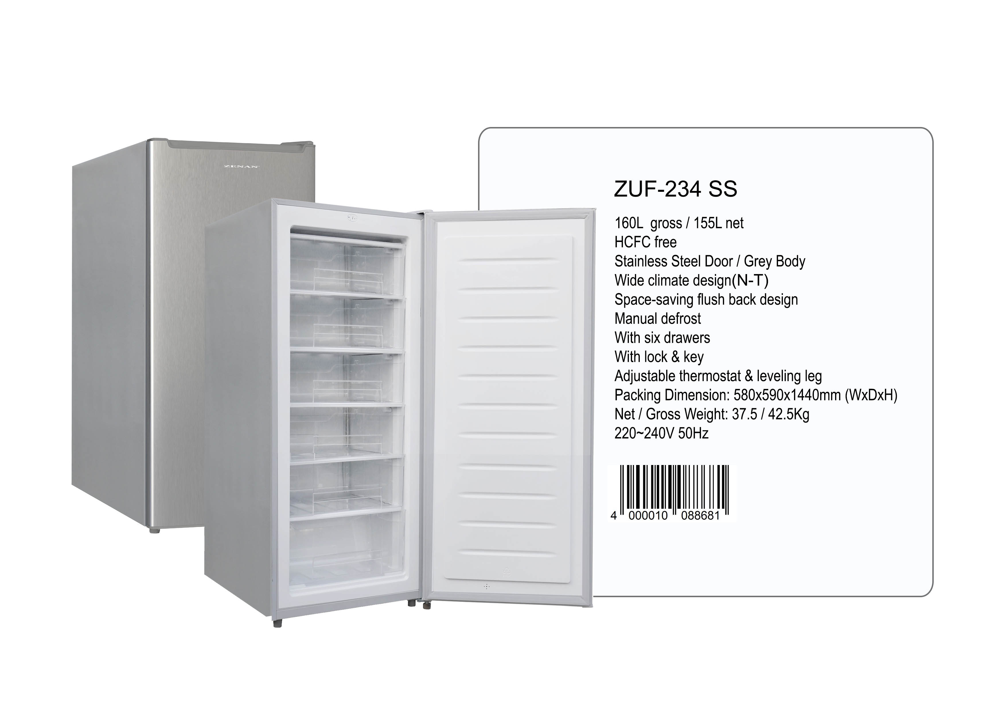 Zenan Upright Freezer, 160 Liters, Model Zuf-234Ss1,179.00NovoProduto Limitado